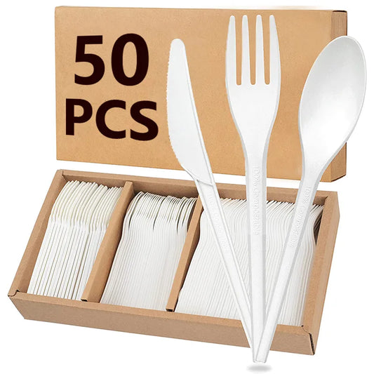 50/30/20/10pcs Disposable Natural Corn Dinnerware Knife Fork Set For Wedding Birthday Party Utensil Dessert Cake Spoon Tableware