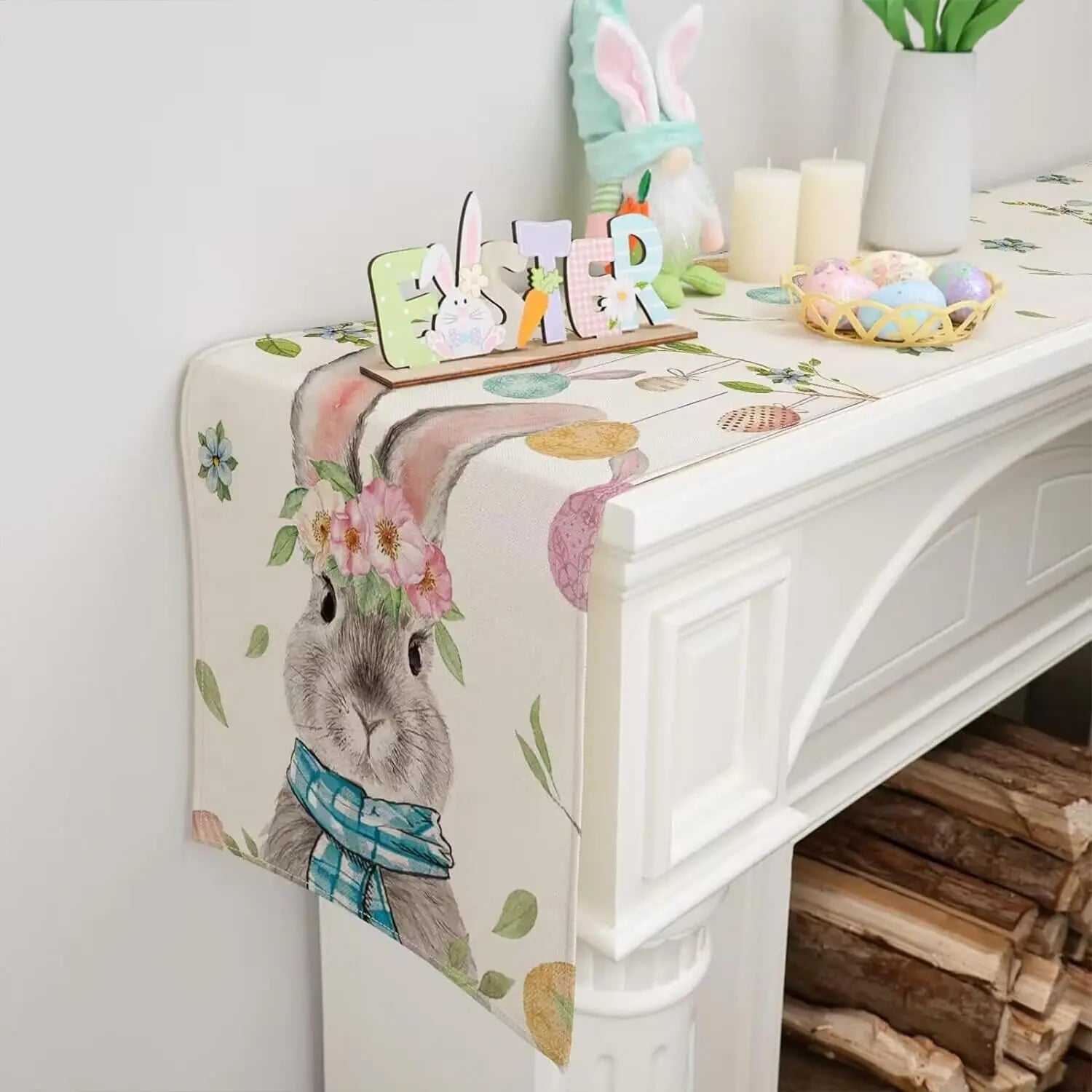 Happy Easter Bunny Linen Table Runner Spring Flowers Bunny Egg Easter Decor Farmhouse Kitchen Dining Table Holiday Party Decor