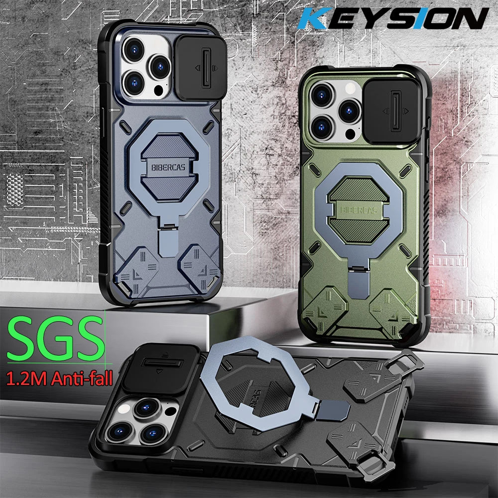 KEYSION Shockproof Case for MagSafe for iPhone 15 Pro Max 15Plus Silicone+PC Magnet Ring Stand Phone Cover.