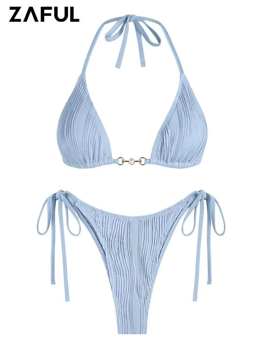 ZAFUL Women's Halter Textured Bikini Set Tie Side Cheeky String Swimwear Triangle Swimsuit High Leg Bathing Suit 2024 Beachwear
