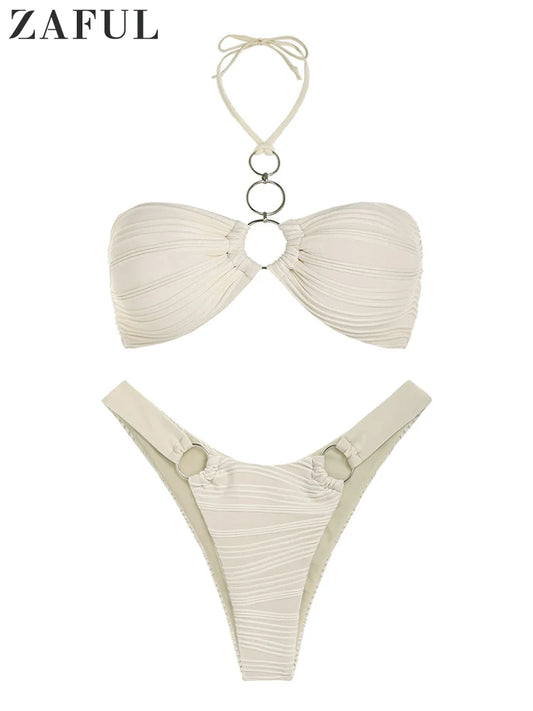 ZAFUL Women's High Cut Bikini Set Swimsuit Brazilian Halter Jacquard Textured O-ring Bikini Swimwear Two Pieces Bathing Suit