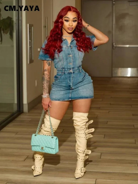 CM.YAYA Women Short Sleeve Single Breasted Turn-down Collar Denim Bodycon Midi Dress 2024 Fashion Pencil Chic Dresses Vestidos