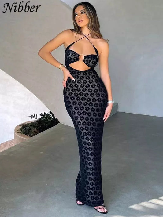 Nibber Solid Color Hanging Neck Maxi Dress Sexy Hollow Women