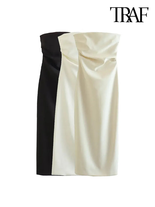 TRAF Women Fashion Strapless Gathered Midi Dress Sexy Straight Neck Back Slit Female Dresses Vestidos Mujer