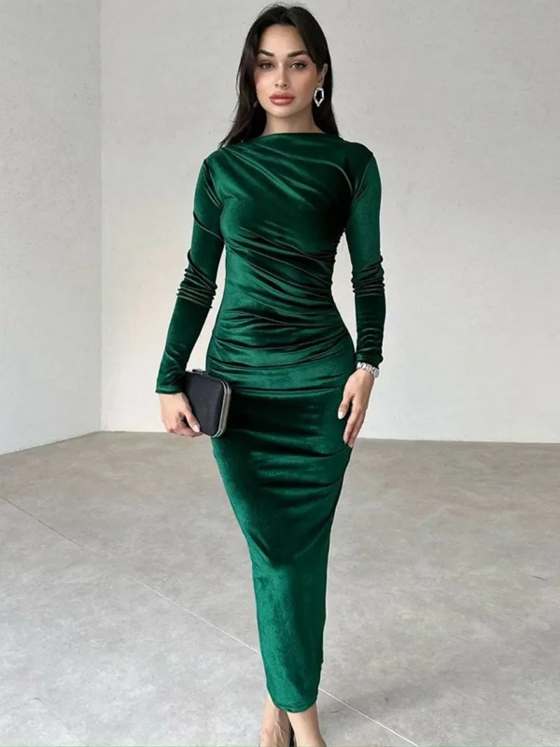 Women O-neck Folds High Waist Mid-calf Velvet Dress Elegant